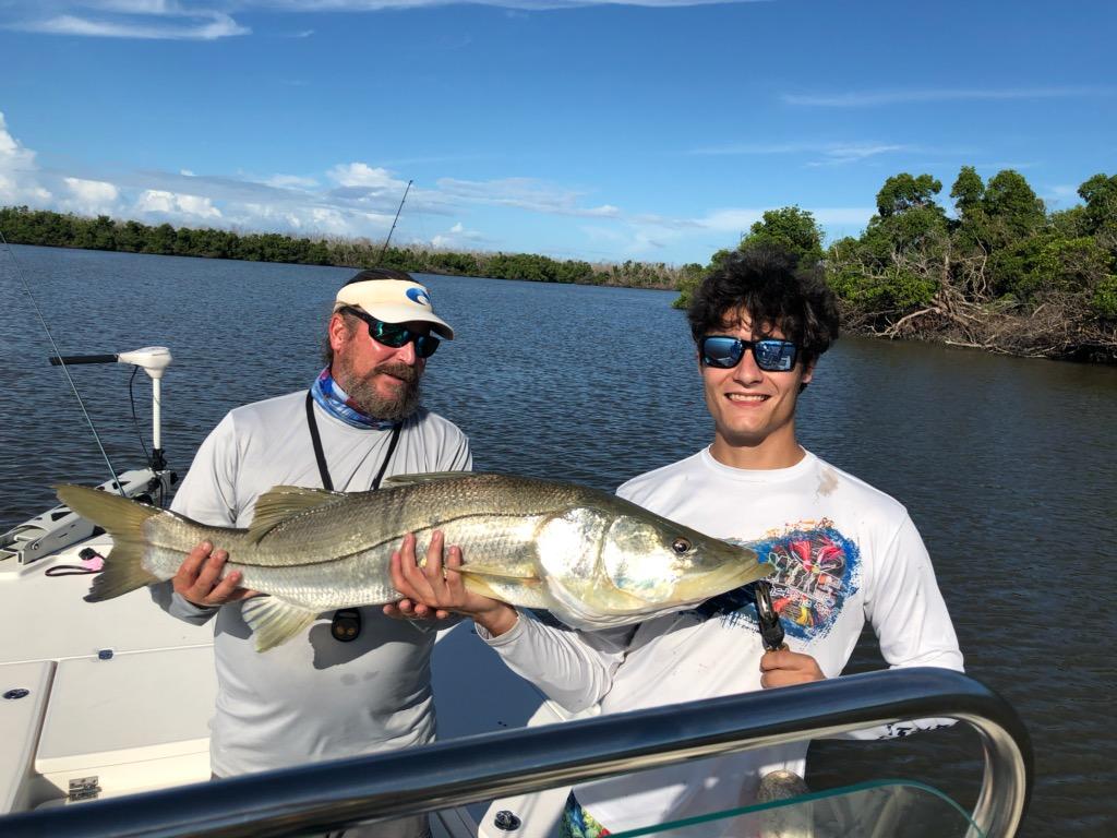 Summer time fun! July and August were hot, fishing and the weather. The average heat index was 95 degrees with afternoon showers cooling the evenings off and putting the temperatures back into the upper 70’s. Average water temperatures were 88 to 90 degrees slowing the bite in the afternoon. It did make for some great morning fishing and bird watching, pictured below is a beautiful Rosy Spoon Bill that was nice enough to tell Geoff where that Snook was at.
